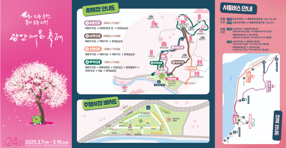 - 운행노선: 1구간 - 둔치주차장 <-> 매화축제 행사장, 2구간 - 소둔치주차장 <-> 매화축제 행사장
